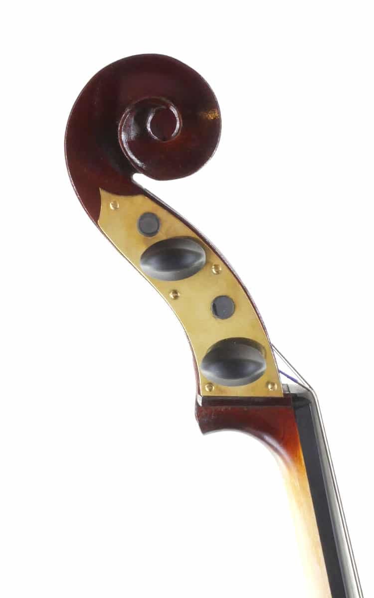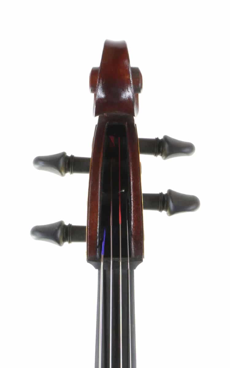 In our private collection is a very original Dearborn ‘church bass’ dating back to the 1830s. These instruments were built to accompany small town church choirs long before they had the ability to afford reed or pipe organs. Abraham Prescott started his string instrument company in the late 1700s by selling church basses to small rural churches and his young apprentices the Dearborn brothers continued as his concentration moved to church organs. Our Dearborn church bass shares many Prescott bass details, such as the striking carved scroll, bee stinger inset brass scroll plates and hand hammered paddle tuning keys geared to the pegs. In appearance and playing feel it’s basically an elegant, long-bodied cello.