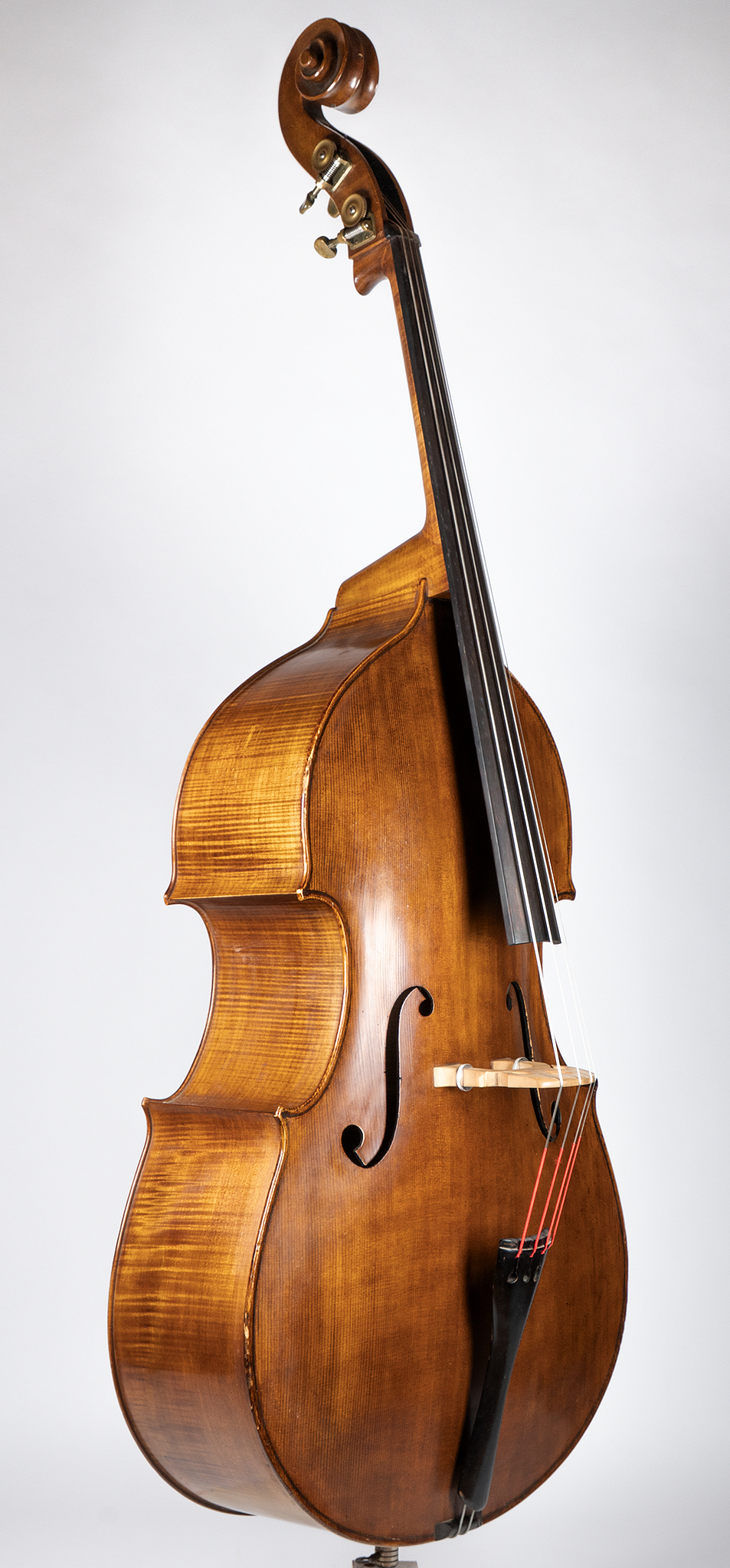 A remarkably healthy and beautifully built orchestral bass from Albert Jakstadt, number 29, completed in 1995 in Cincinnati, Ohio. This instrument shows the thoughtful hand of a maker who clearly knew his materials and design. Two piece broad-grained spruce top and big-leaf maple back and sides and an X-braced flat back.