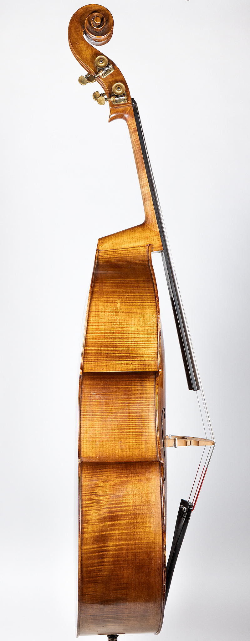 This is a warm, orchestral-voiced instrument with a broad, open tone, reminiscent of Abraham Prescott and Don Gorman basses we’ve featured. With Spirocore Weichs currently on, the sound is round and responsive, with a big low E and a singing G. It’s very playable under the bow, with smooth access across all registers thanks to well-placed C-bouts and a clean neck heel.