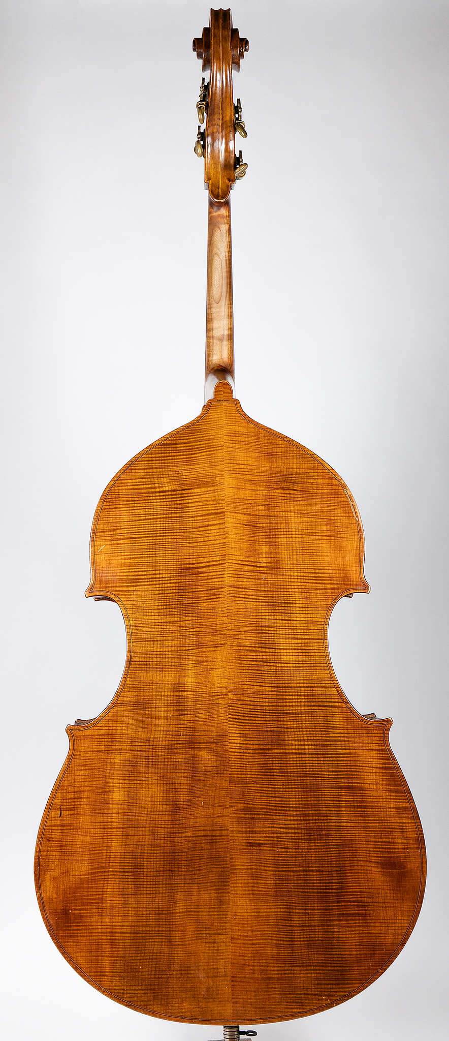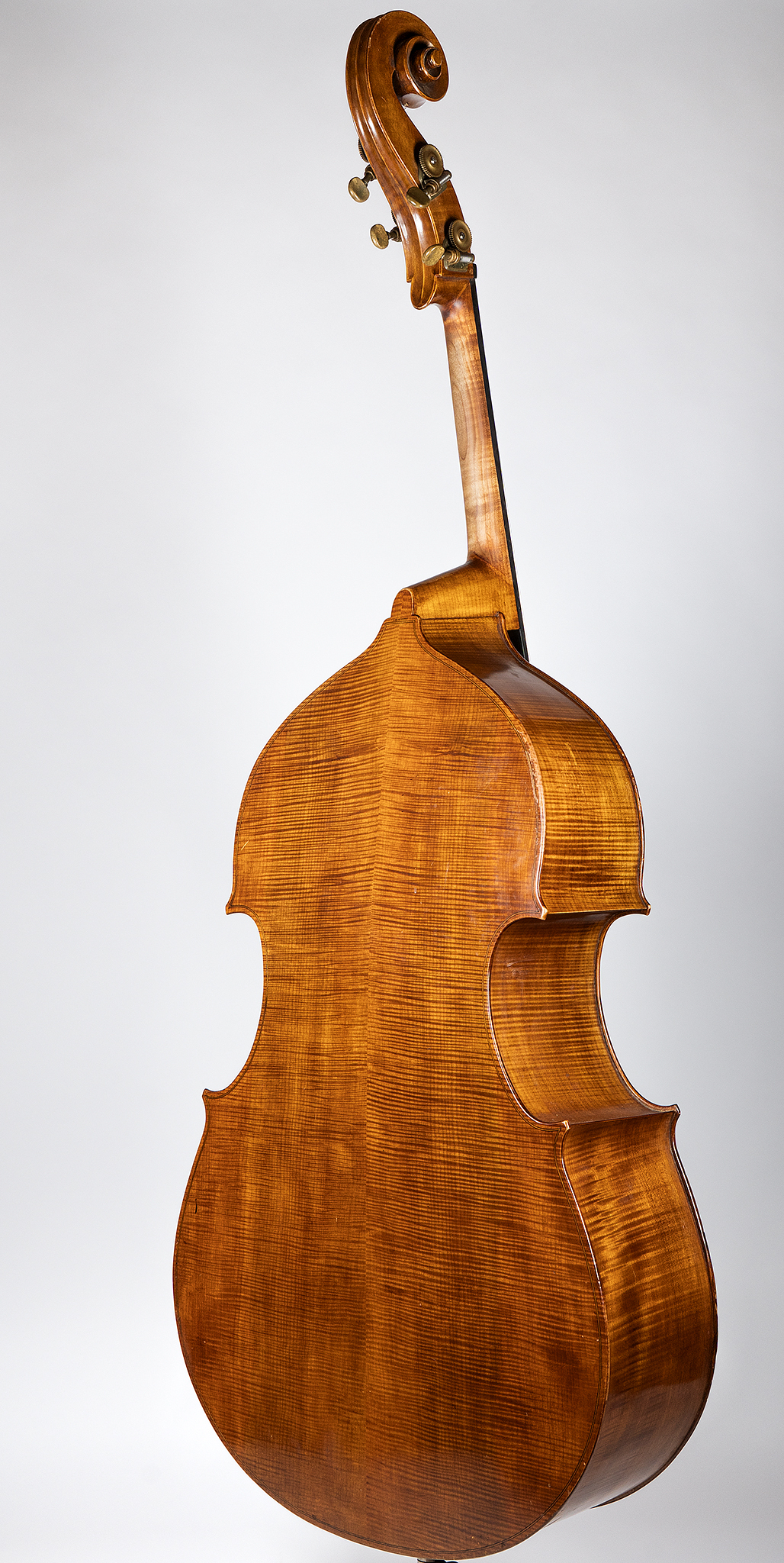 This bass is in excellent structural shape — no soundpost or saddle cracks, no surprises in the back, just authentic wear from being loved and used. The back and ribs are beautifully figured, with strong flame contrasting the grain. Bumpers are installed, and the Sloane tuners carry a handsome, aged patina that matches the instrument’s character.