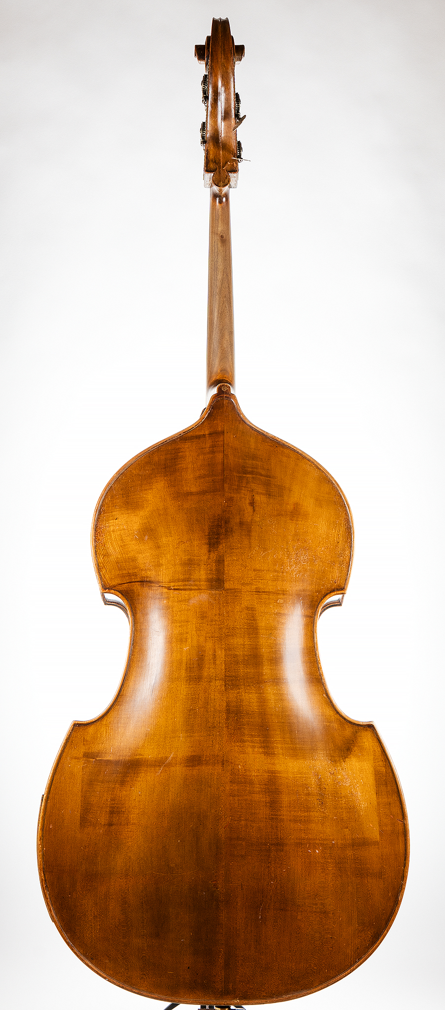 This instrument shows signs of regular professional use. Cosmetic wear includes a repaired back seam and a visible crack below the bass-side f-hole (stable and addressed as part of recent maintenance). The neck exhibits minor blemishing that does not affect performance. Tonally, the instrument is exceptionally balanced, with a notably warm and rounded sound—significantly fuller than typical examples of this pattern.