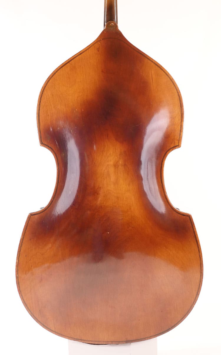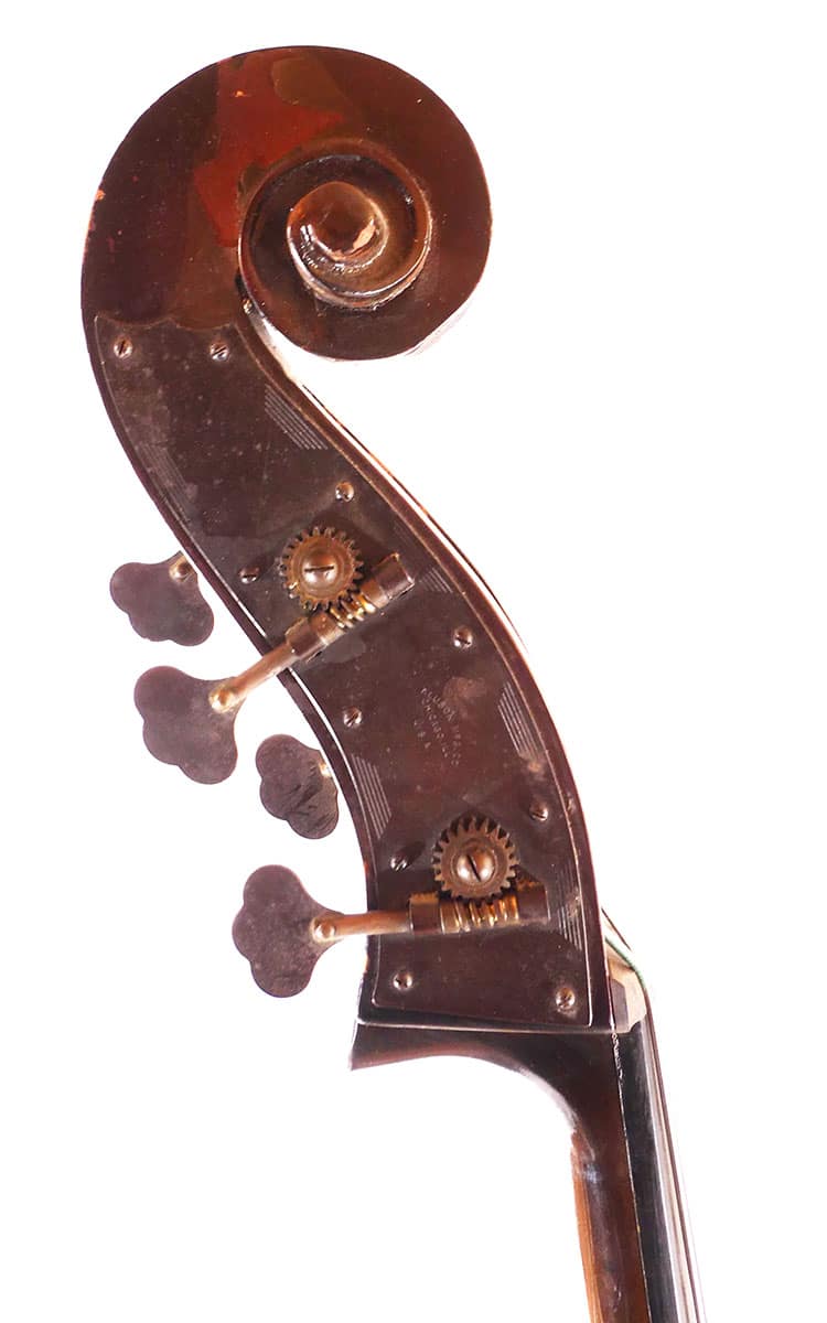 Very cool early Kay double bass from one of the first full early years of production. Gamba cornered, medium brown honey burst. Nice original stamped Kluson scroll plates.