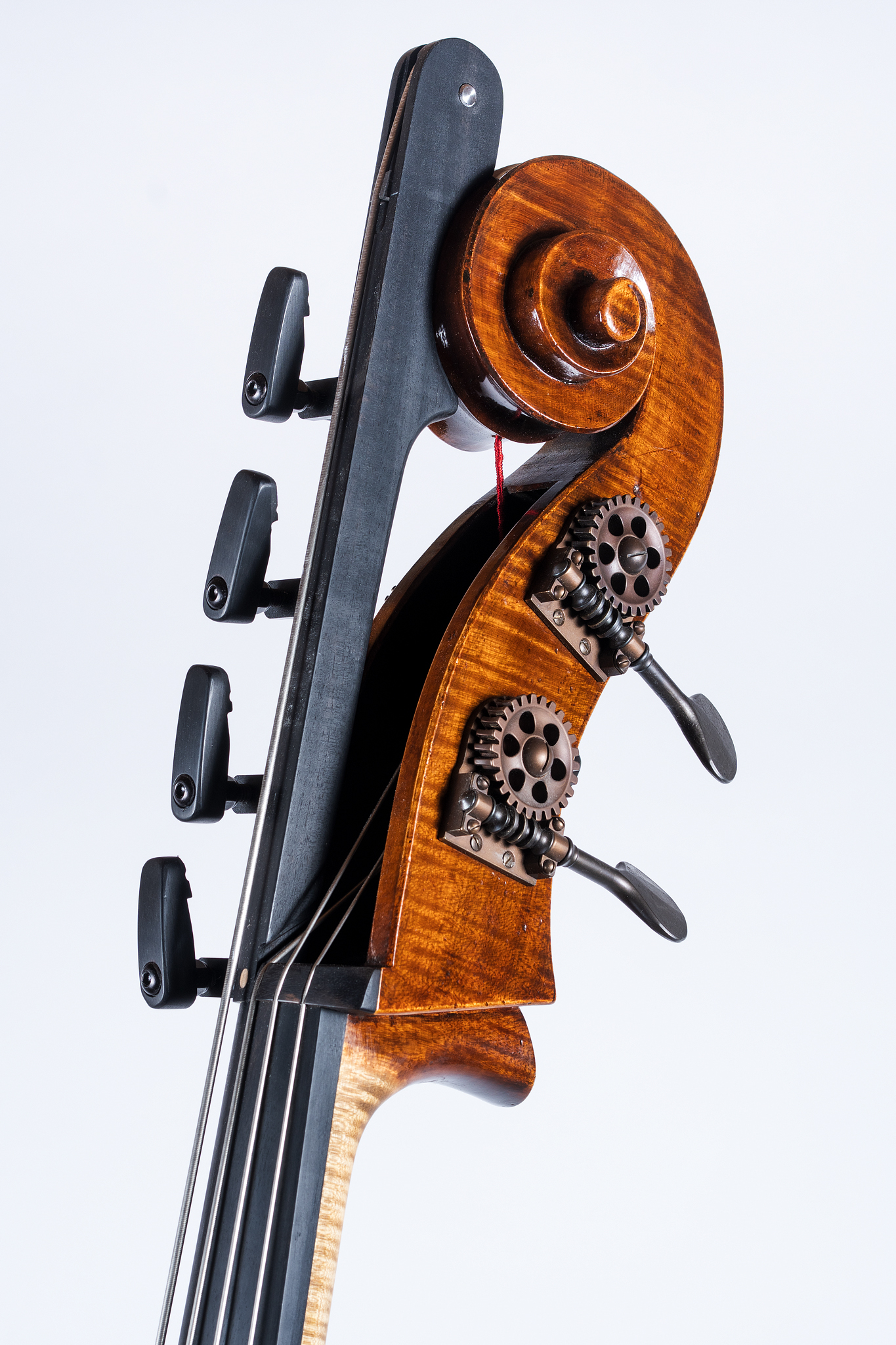 This double bass is fitted with a beautifully made C extension with smooth, reliable gates. The instrument is finished in a light oil antiqued varnish with subtle color variation and hand-applied aging throughout the top, ribs, and back, giving it the appearance, and feel, of a well played-in instrument from the moment it is picked up. The beautiful wood choices, and innovative details like the adjustable saddle reflect Schnitzer’s approach throughout.